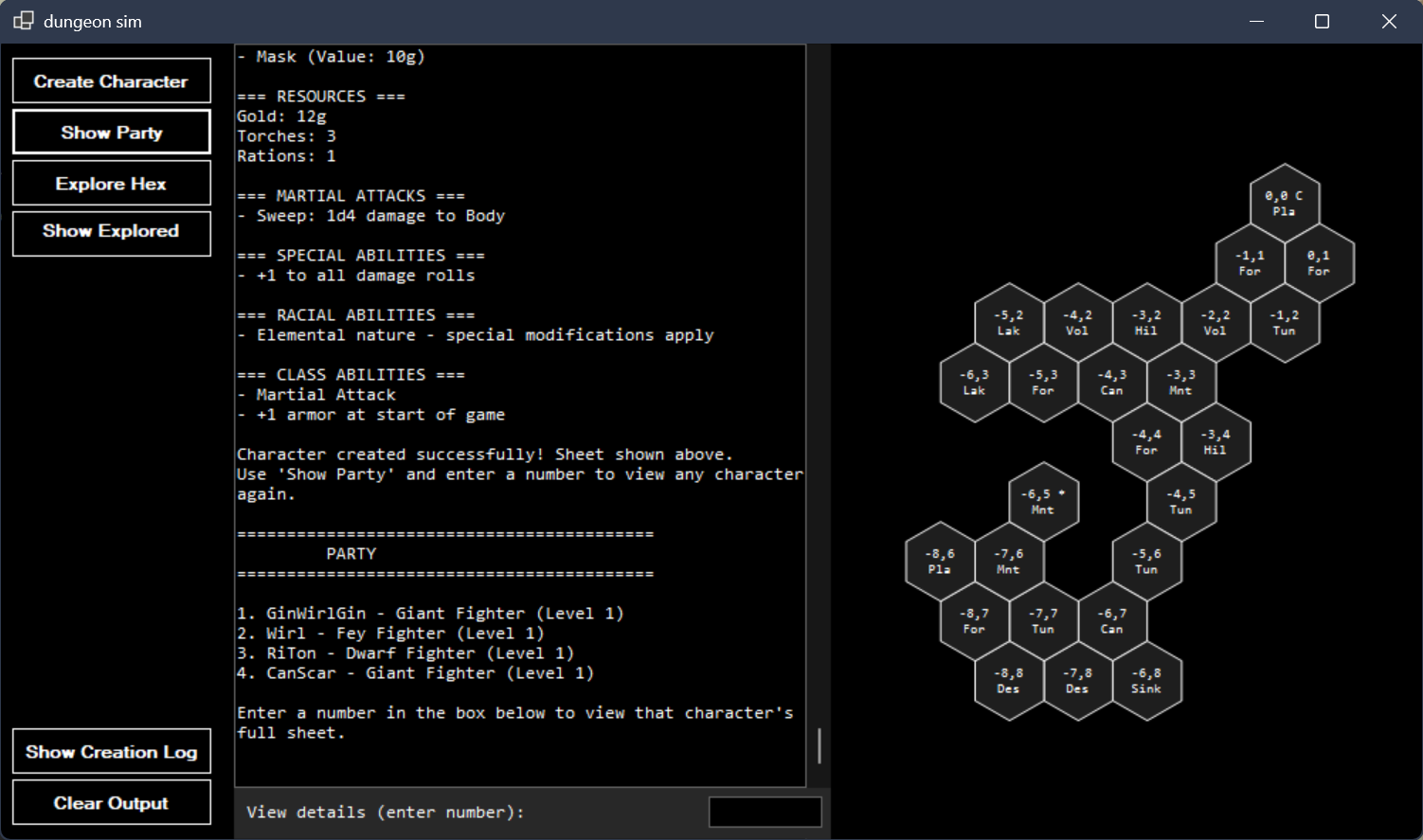 A TTRPG-style simulator with original rules, create a party, explore the world, enter dungeons, and engage in a variety of encounters.